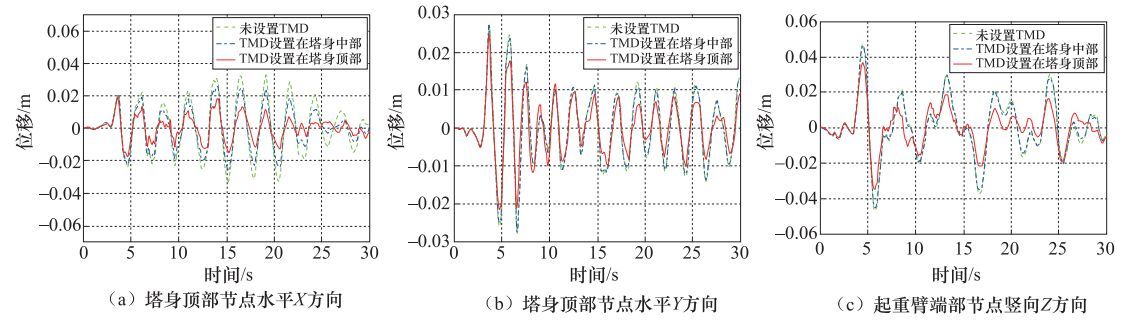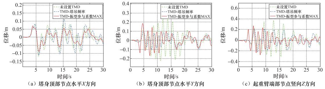 方案 第一阶 第二阶 第三阶 未设置TMD 6.24391 4.72713 2.61045 TMD设置在塔身中部 6.24397 4.72714 2.60781 TMD设置在塔身顶部 6.24402 4.73268 2.59619 表 4 控制位移最大值及减震率汇总