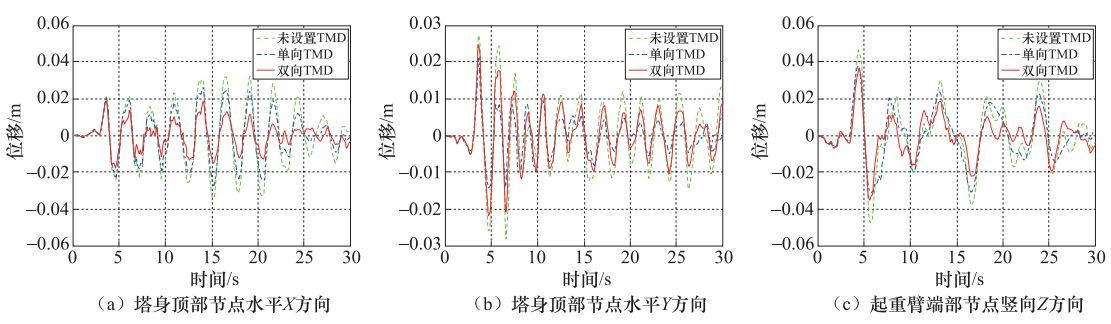 输入地震波 方向 减震前最大位移/m 方案1 方案2 最大位移/m 减震率/% 最大位移/m 减震率/% Taft波 X 0.031 0.024 22.58 0.020 35.48 Y 0.029 0.028 3.45 0.026 10.34 Z 0.048 0.047 2.08 0.036 25.00 RSN164-147波 X 0.027 0.024 11.11 0.011 59.26 Y 0.023 0.022 4.34 0.015 34.78 Z 0.060 0.052 13.33 0.041 31.67 El-Centro波 X 0.052 0.046 11.54 0.013 75.00 Y 0.077 0.069 10.39 0.048 3.66 Z 0.153 0.150 1.96 0.092 39.87 注:表中X、Y、Z分别对应与塔身顶部X方向、塔身顶部Y方向和起重臂端部Z方向位移。方案1指塔身中部安装TMD装置;方案2指塔身顶部安装TMD装置。 表 5 控制位移最大值及减震率汇总