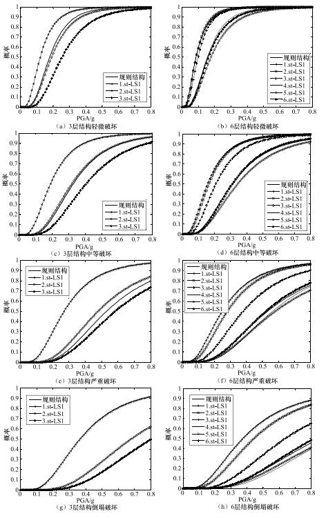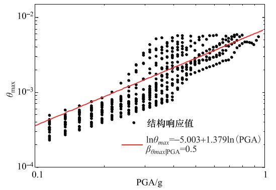 破坏状态 层间位移角均值(${\mu _{{\theta _{\max }}|DS}}$) 变异系数(${\delta _{{\theta _{\max }}|DS}}$) 层间位移角中值(${\eta _{{\theta _{\max }}|DS}}$) 对数标准差(${\beta _{{\theta _{\max }}|DS}}$) 轻微破坏(LS1) 1/1600(0.000625) 0.35 0.00059 0.34 中等破坏(LS2) 1/700(0.00143) 0.35 0.00135 0.34 严重破坏(LS3) 1/350(0.0028) 0.35 0.00264 0.34 接近倒塌(LS4) 1/200(0.005) 0.35 0.0047 0.34 表 3 规则结构回归系数A、B