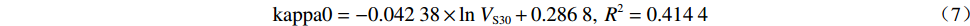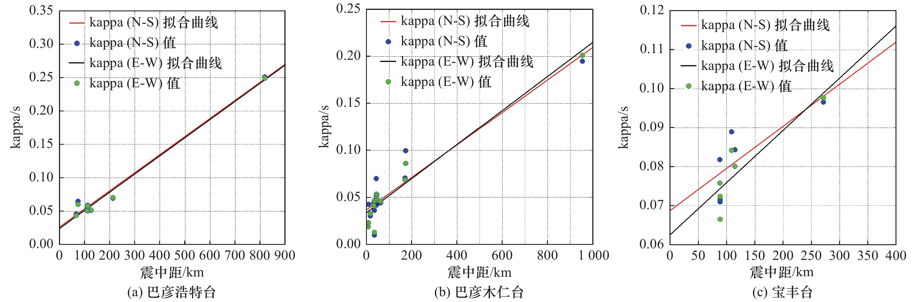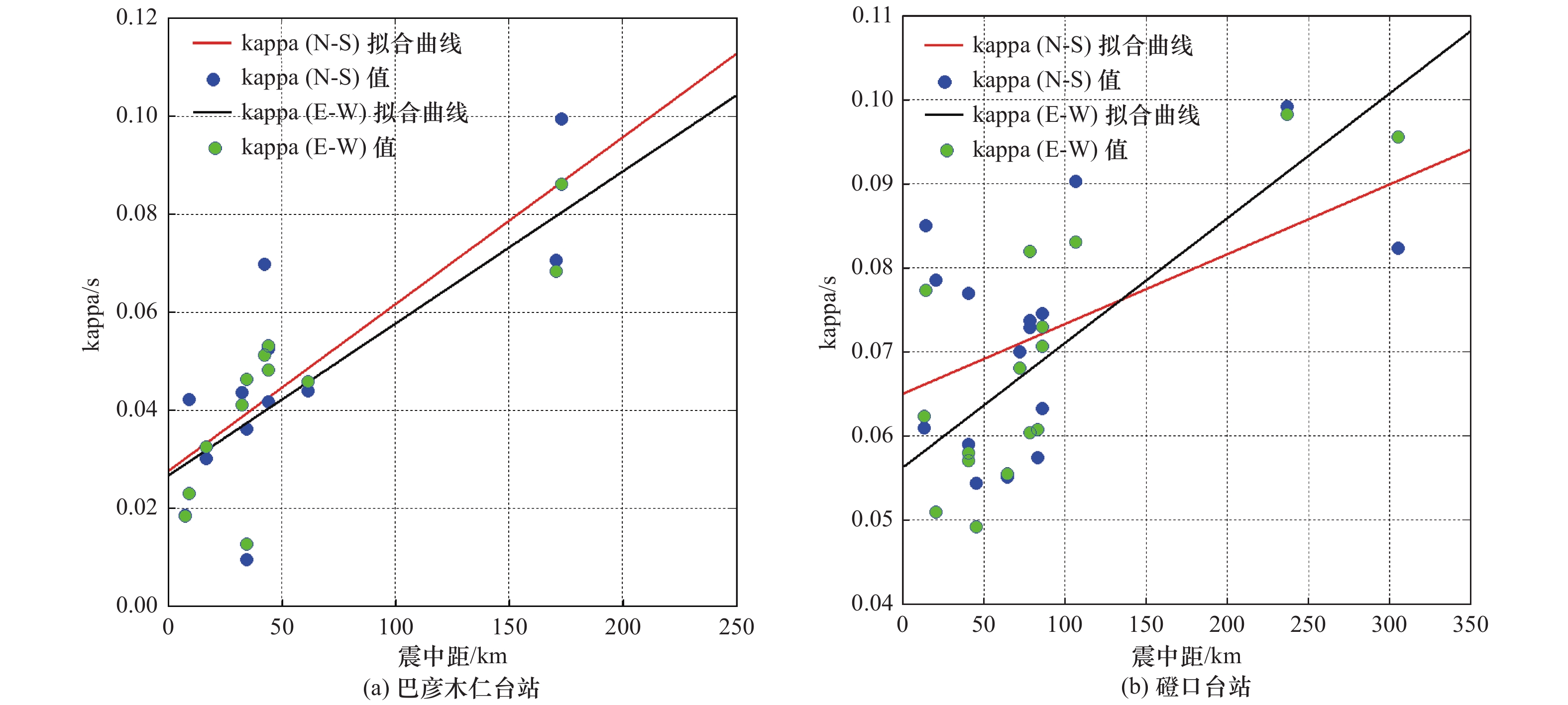 台站名称 方向 回归方程 K0/s 拟合优度值/R2 $ {{\bar{{K}}}_{\rm{0}}}$/s VS20/m·s−1 VS30/m·s−1 巴彦浩特 N-S kappa=0.000 3R+0.0264 0.0264 0.9803 0.02530 343.05 370.2 E-W kappa=0.000 3R+0.0242 0.0242 0.9854 巴彦木仁 N-S kappa=0.000 2R+0.0363 0.0363 0.8691 0.03485 353.4 389.4 E-W kappa=0.000 2R+0.0334 0.0334 0.9280 宝丰 N-S kappa=0.000 1R+0.0687 0.0687 0.6055 0.06560 180.4 222.1 E-W kappa=0.000 1R+0.0625 0.0625 0.7876 磴口 N-S kappa=0.000 1R+0.0605 0.0605 0.8971 0.05845 231.7 261.7 E-W kappa=0.000 1R+0.0564 0.0564 0.9425 干盐池 N-S kappa=0.000 1R+0.0531 0.0531 0.7542 0.05245 317.4 357.3 E-W kappa=0.000 1R+0.0518 0.0518 0.7194 公地 N-S kappa=0.000 2R+0.0541 0.0541 0.9790 0.05450 222.7 251.2 E-W kappa=0.000 2R+0.0549 0.0549 0.9730 吉兰泰 N-S kappa=0.000 2R+0.0526 0.0526 0.8812 0.05525 327.7 335.8 E-W kappa=0.000 2R+0.0579 0.0579 0.7826 临河 N-S kappa=0.000 1R+0.0530 0.0530 0.9977 0.05175 232.3 249.7 E-W kappa=0.000 1R+0.0505 0.0505 0.9960 灵武 N-S kappa=0.000 3R+0.0449 0.0449 0.9996 0.04415 292.6 325.1 E-W kappa=0.000 3R+0.0434 0.0434 0.9957 前进农场 N-S kappa=0.000 3R+0.0637 0.0637 0.7536 0.06555 209.5 248.9 E-W kappa=0.000 3R+0.0674 0.0674 0.6815 青铜峡 N-S kappa=0.000 1R+0.0428 0.0428 0.4987 0.04315 219.0 260.0 E-W kappa=0.000 1R+0.0435 0.0435 0.6287 沙海 N-S kappa=0.000 2R+0.0489 0.0489 0.9743 0.04870 188.3 216.5 E-W kappa=0.000 2R+0.0485 0.0485 0.9710 乌海 N-S kappa=0.000 5R+0.0155 0.0155 0.7320 0.01545 352.7 390.5 E-W kappa=0.000 5R+0.0154 0.0154 0.6702 西吉 N-S kappa=0.000 1R+0.0429 0.0429 0.4713 0.04240 195.1 228.7 E-W kappa=0.000 1R+0.0419 0.0419 0.4909 表 3 巴彦木仁、磴口台站kappa值与震中距拟合结果