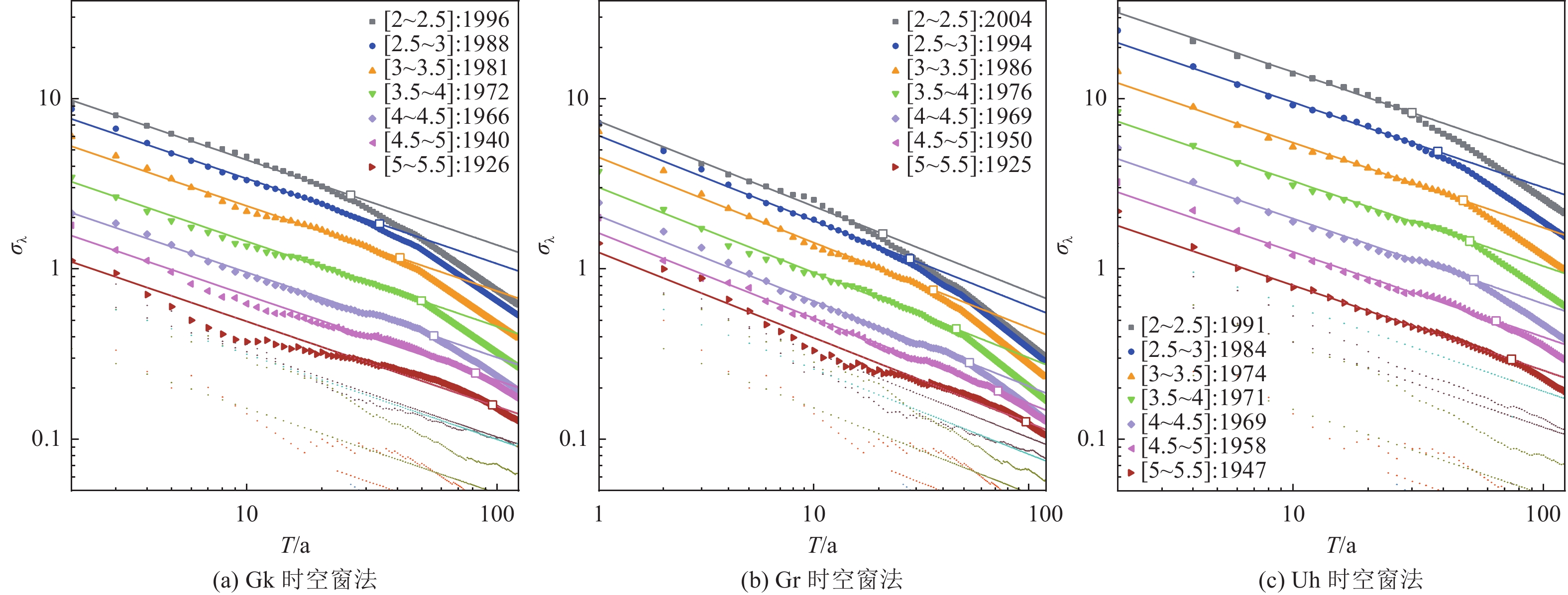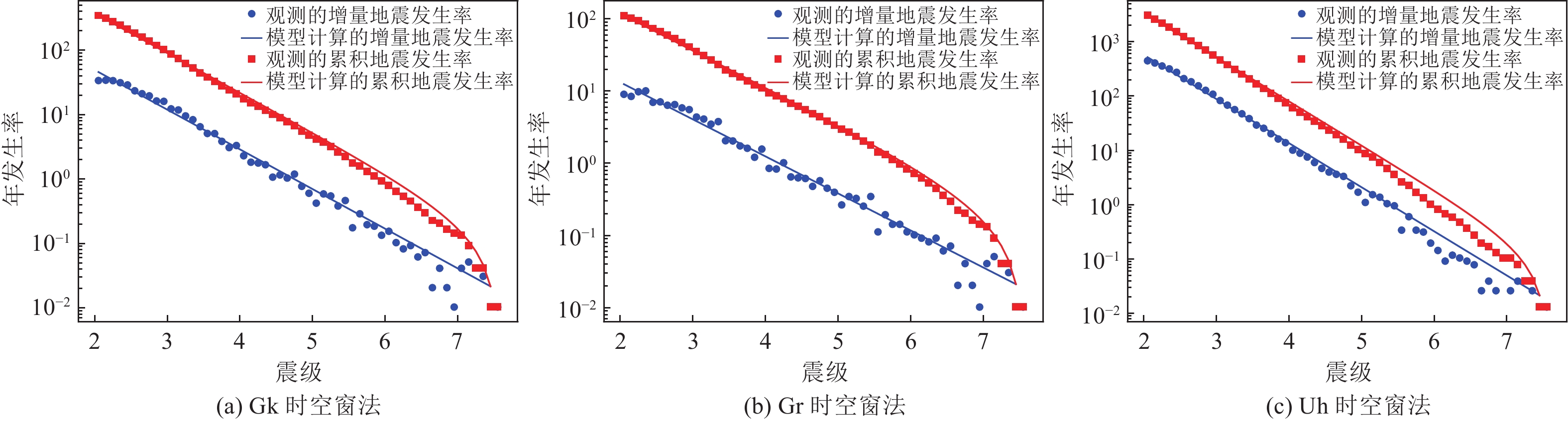 震级档 完整性起始年份 Gk时空窗 Gr时空窗 Uh时空窗 2.0~2.5 1996 2001 1991 2.5~3.0 1988 1994 1984 3.0~3.5 1981 1986 1974 3.5~4.0 1972 1976 1971 4.0~4.5 1966 1969 1969 4.5~5.0 1940 1950 1958 5.0~5.5 1926 1925 1947 表 2 不同极大似然估计方法计算的台湾地区地震活动性参数